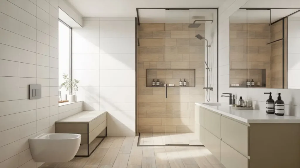 I’m talking about wood tiles with a very subtle, straight grain. Think light-colored woods like ash, maple, or a pale white oak. These options keep the space feeling bright and open while preventing it from looking like a sterile operating room. I once helped a friend design a bathroom like this, and we used a light ash-colored tile on the floor and carried it straight up the shower wall. The result was seamless, clean, and surprisingly warm.