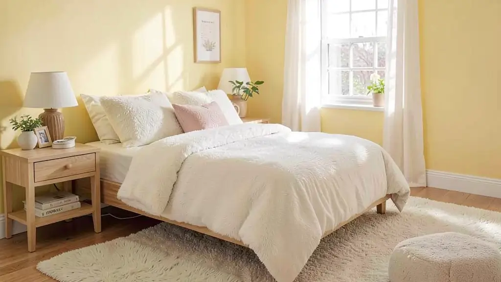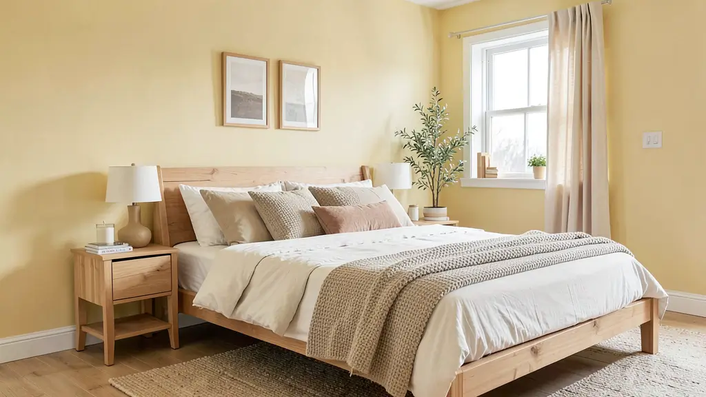 Layer in plenty of soft textures: chunky knit blankets, velvet pillows, maybe a plush area rug. The pastel yellow acts as this gorgeous backdrop that makes everything feel more inviting. Add some warm wood tones and you’ve got yourself a space that screams “stay in bed all day.” 🙂