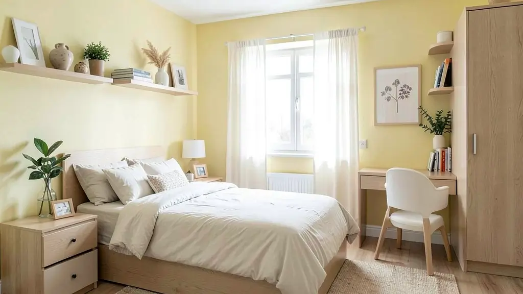The key is choosing the right shade and using smart design tricks. You want pale, warm yellows rather than bright or cool-toned ones. Pair this with strategic mirrors, and you’ll basically double your perceived space. IMO, it’s the smartest move you can make in a small bedroom.